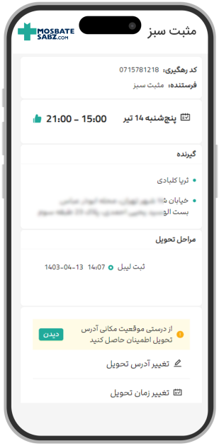 مشتریان شما از زمان ثبت مرسوله پیامکی حاوی لینک صفحه رهگیری دریافت میکنند که امکانات شخصیسازی شدهای مثل تریس مرسوله، تغییر آدرس و ... را دارند.